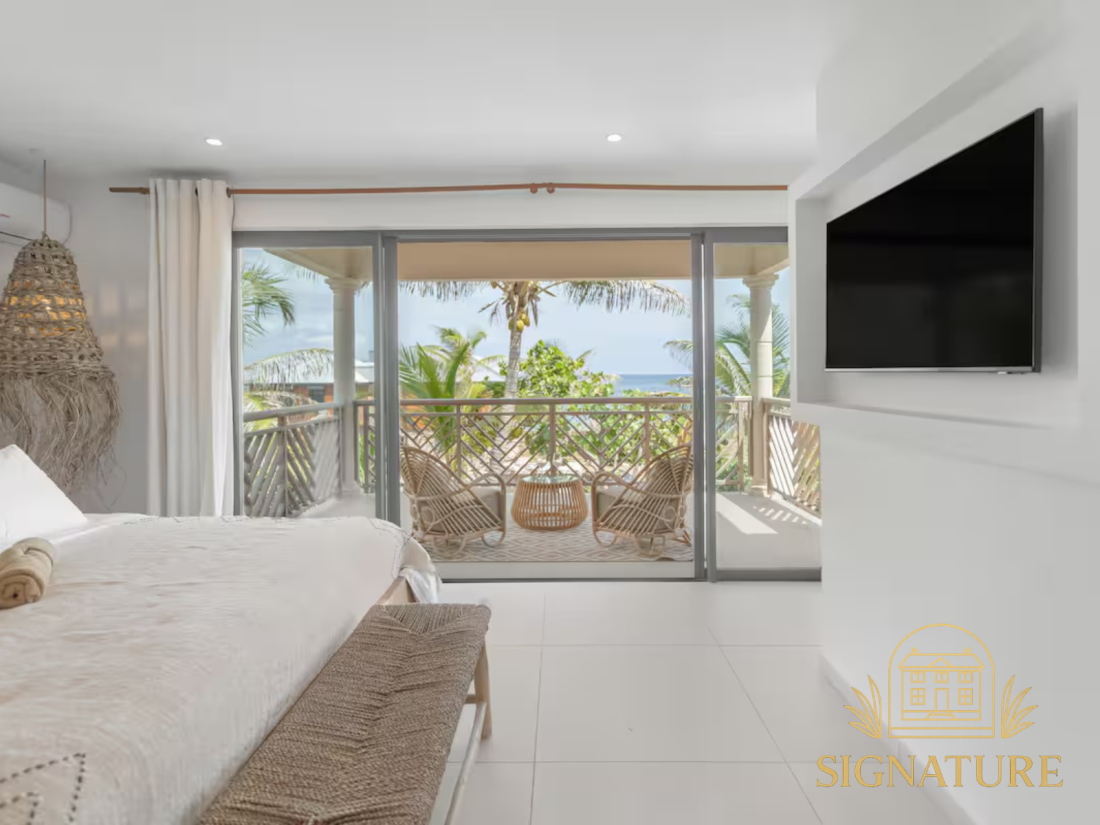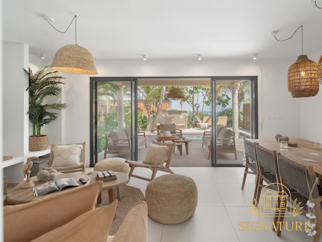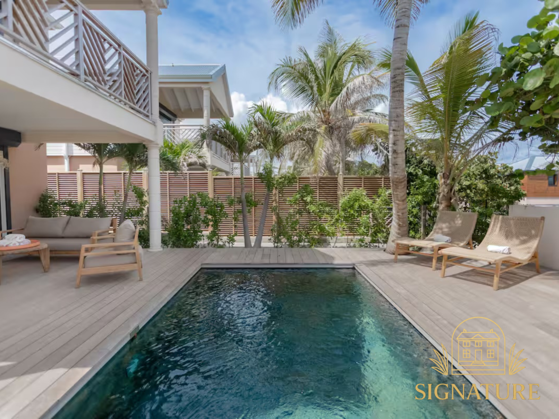 Située dans le secteur recherché d’Oyster Pond, à proximité de la marina et de la partie hollandaise, cette villa T4 récemment rénovée offre un cadre de vie agréable dans un environnement résidentiel calme et sécurisé. Description du bien :Développant une surface habitable de 112 m², la villa est agencée sur deux niveaux. Le rez-de-chaussée accueille une cuisine ouverte entièrement aménagée et équipée avec arrière-cuisine, une spacieuse pièce de vie lumineuse ainsi qu’un WC invités. À l’étage, l’espace nuit se compose de trois chambres et de trois salles d’eau, offrant confort et fonctionnalité, aussi bien pour une occupation à l’année que pour un projet locatif. Les extérieurs ont été pensés pour profiter pleinement du climat, avec une terrasse couverte de 14 m², une terrasse découverte d’environ 40 m², un jardin privatif paysagé et une piscine, le tout au sein d’une résidence sécurisée appréciée pour son calme. La villa est vendue entièrement meublée, avec des prestations neuves, offrant un bien prêt à être occupé ou exploité immédiatement. Prix : 787 500 € FAI Ref : 1847